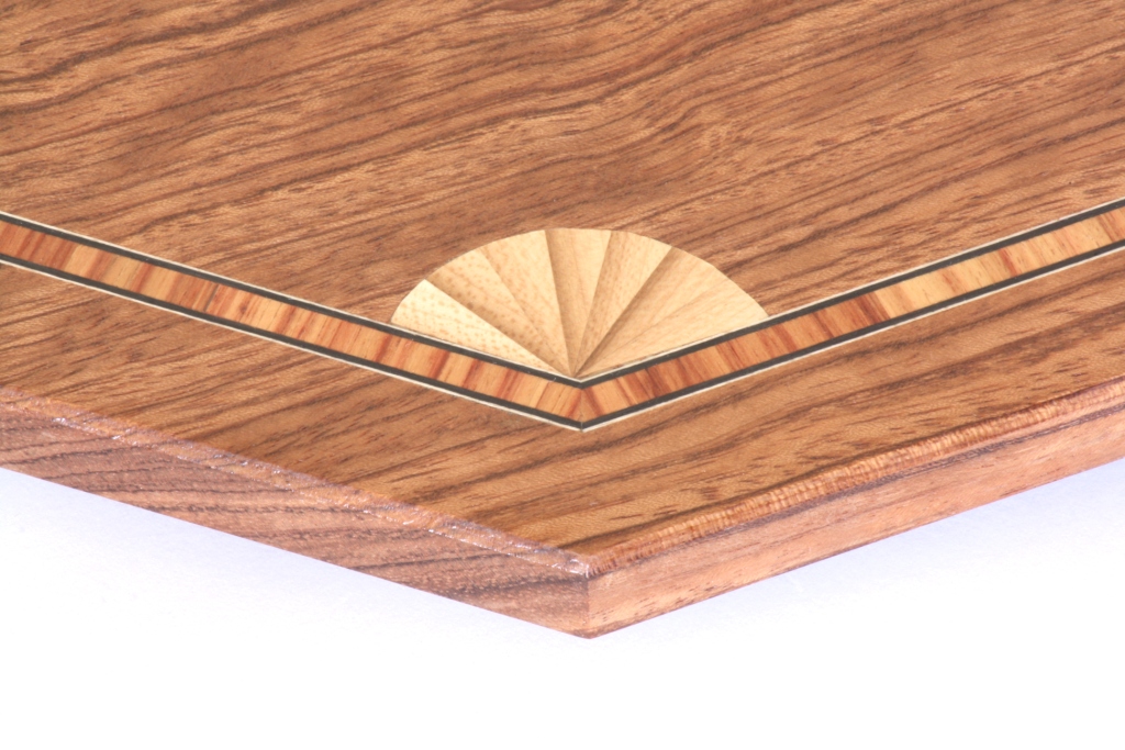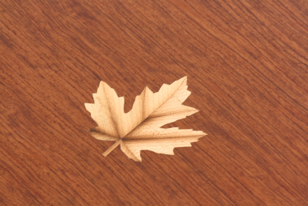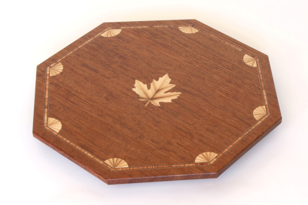 This Lazy Suzan was made using Quarter Sawn Bubinga, chosen because of the high amount of chatoyance which makes the wood shimmer as it rotates. The maple leaf and fan inlays are Quarter Sawn Maple which was sand shaded and the perimeter banding is Tulipwood. The lazy Suzan is perfectly sized for a smaller service like tea or dessert.