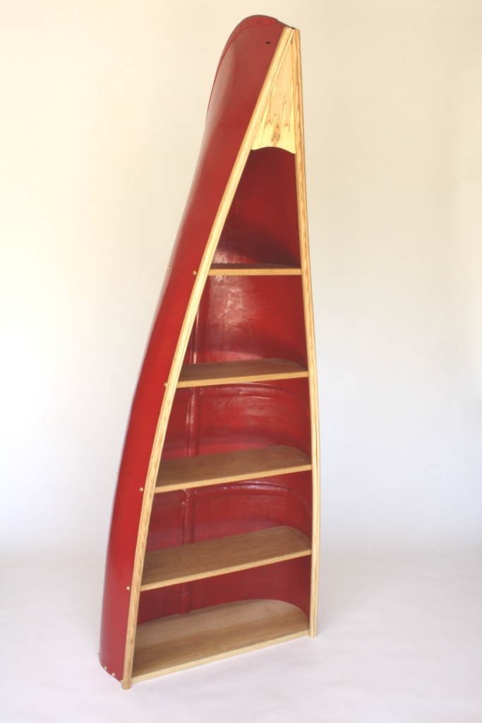 In terms of cottage furniture, nothing is more iconic than the canoe bookshelf. This one is built fron a salvaged and refurbished fibreglass canoe. The vibrant cherry red is a wonderful splash of color in any room.