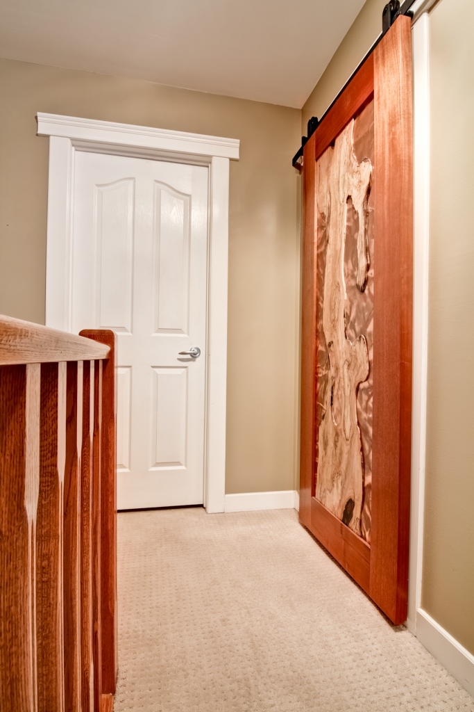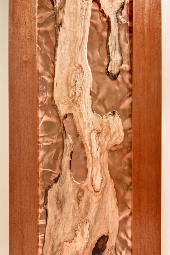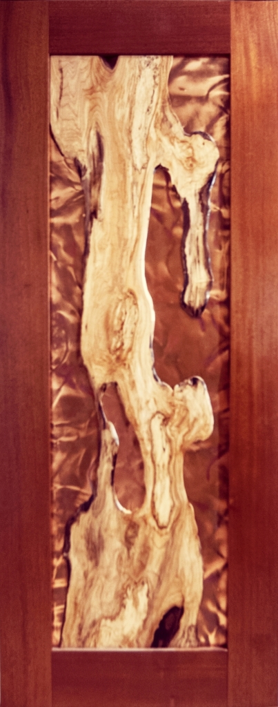 After Finding a gorgeous piece of Spalted Maple I kept my mind open looking for the right way to put it into a project. I received the copper from a friend and that galvanized the concept. With Samples in hand I went to the lumber store and found some gorgeous mahogany to round out the project. The door is 32" wide which makes it perfect for use as a barn door in front of a standard 30" bedroom opening.