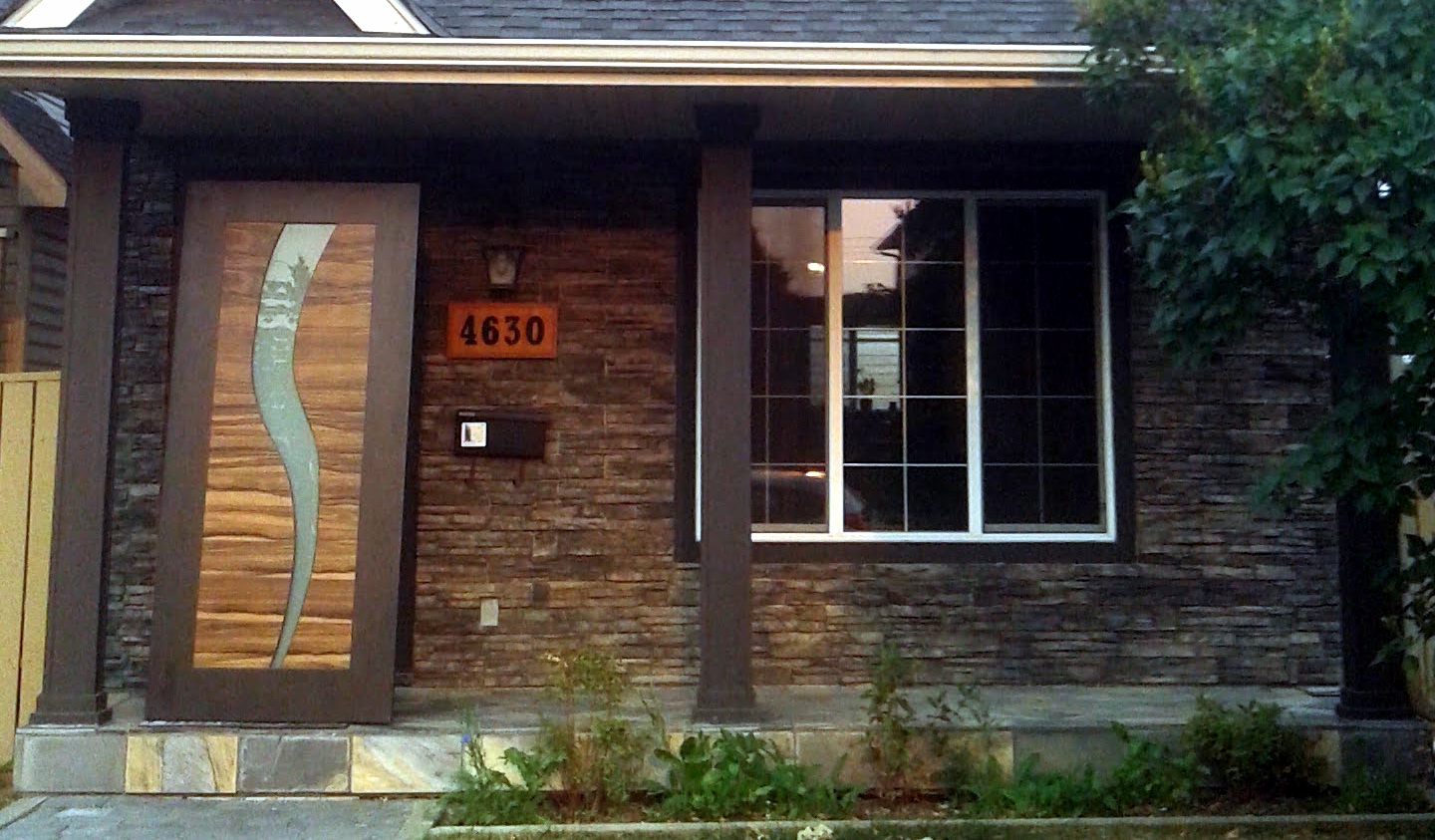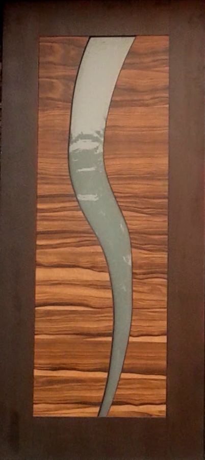 This door was built with a solid wood frame, veneered panels and a sealed glass unit. The sealed glass unit fills the entire frame which lends this door a good heft. The gorgeous ebony veneer was saved from a previous project and had only 1/4" of extra length. It is always satisfying to use of remnants so efficiently and create something so beautiful out of them.
