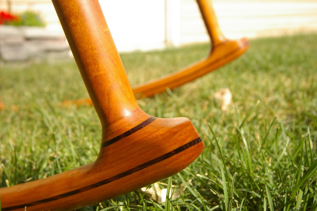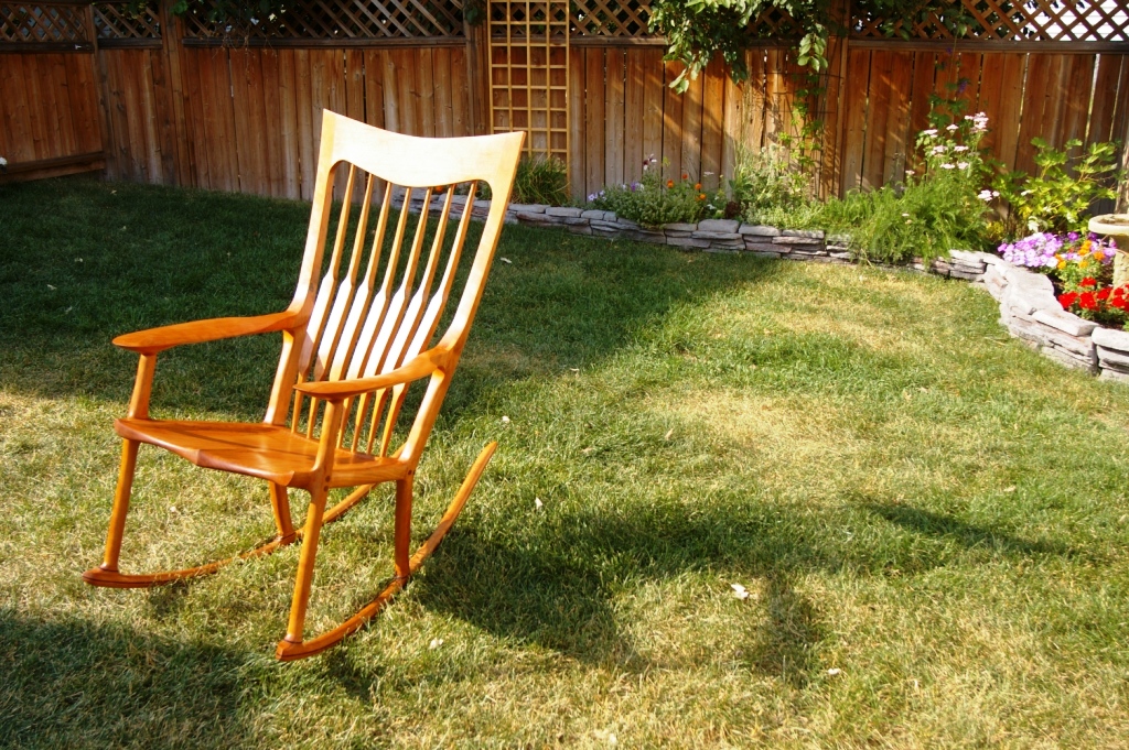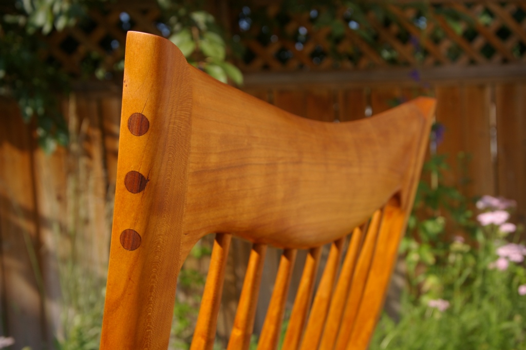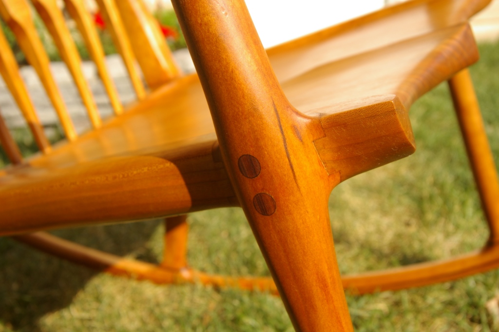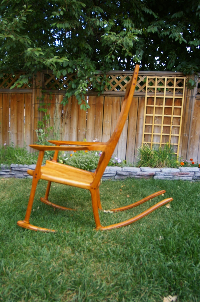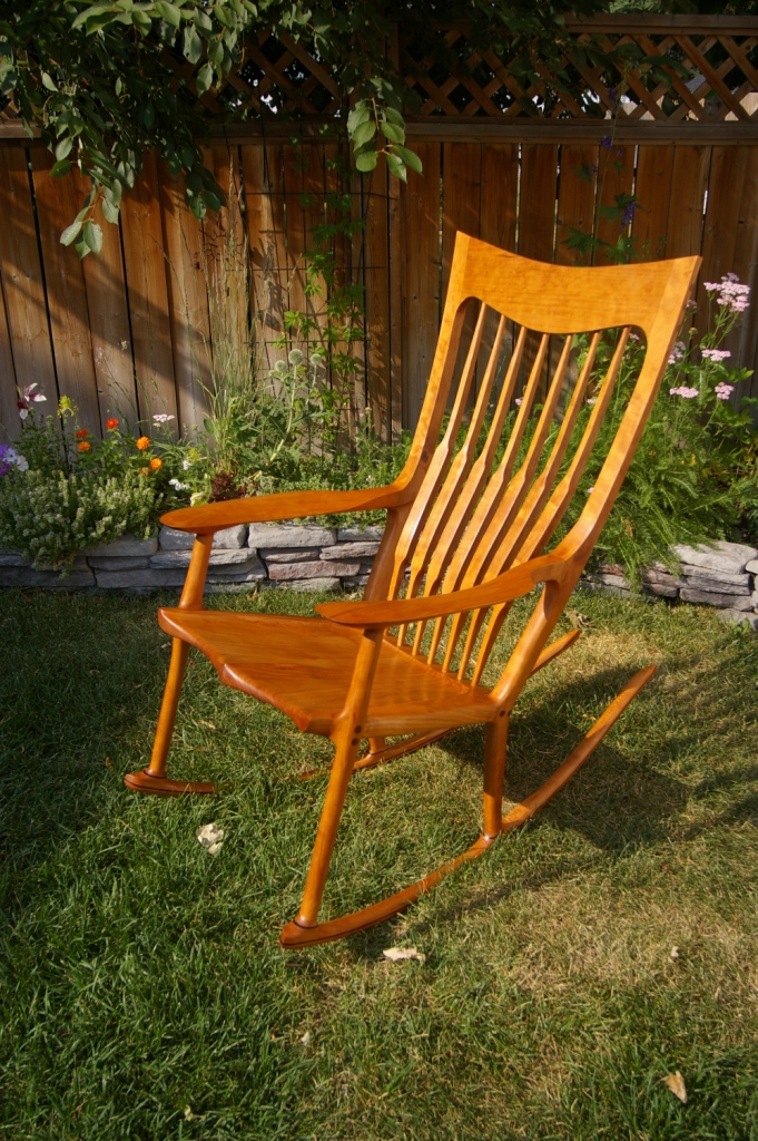 This Maloof inspired sculpted rocker is a wonderfull marriage of beauty and comfort. The sloped arms, scooped headrest and long sweeping rockers all work together and draw the eye over every joint, surface and detail. The sculpted seat cradels, the curved spindles support, and the gentle rocking motion lets you drift into total relaxation. This is a prime example of functional furniture bringing beauty and art into the home.