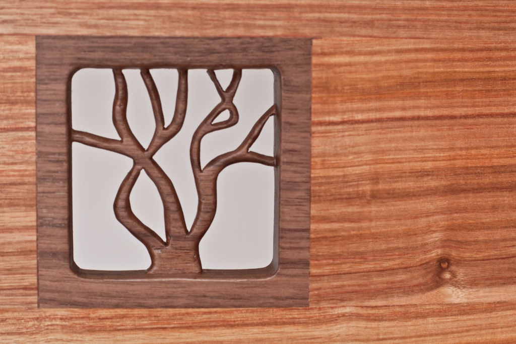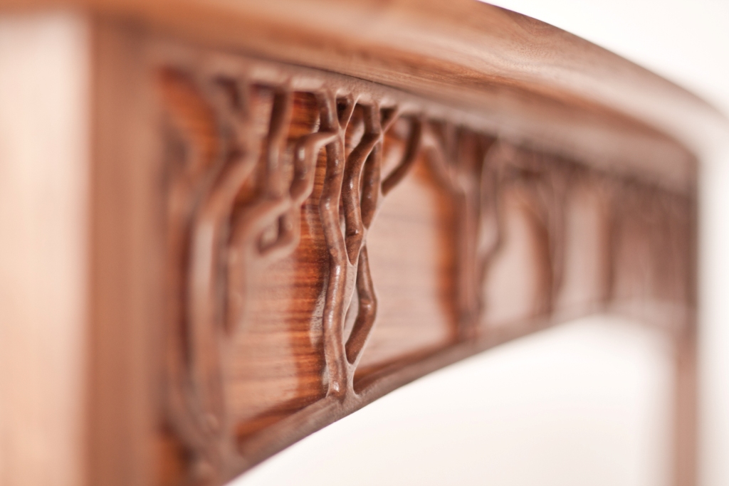 While traveling in Africa, I was taken aback by the beauty of the Acacia trees. These gorgeous trees that generally stand alone and provide shade and food for many of the species in the Savannah are often beautifully photographed, silhouetted by the sunset. Years later, while struggling to design a desk, I saw a carved piercing done by a friend and instantly envisioned this piece in my mind. The struggle had been to find a way to express the beauty in trees-both while living and when used to make furniture-and this is what I hope the piece has captured.